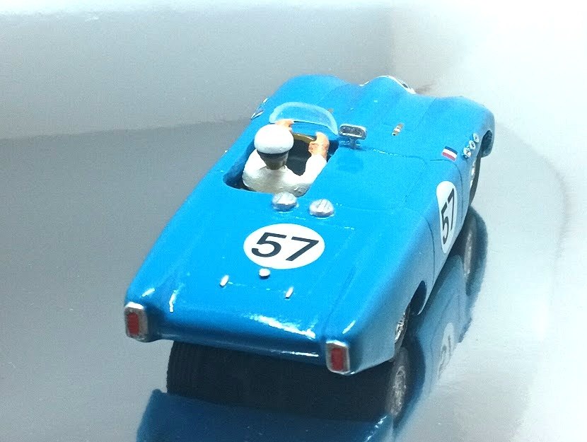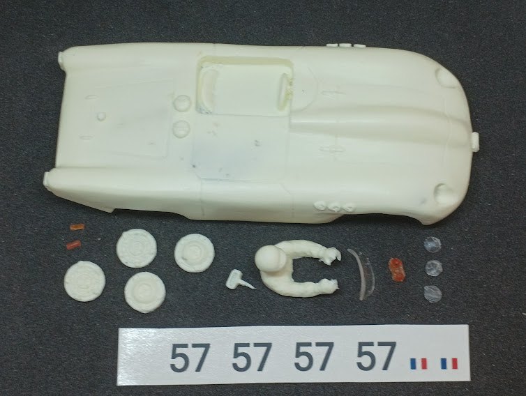 DB PANHARD – HBR N 57 17th LE MANS 1953, paintable resin kit consisting of bodywork, taillight, rearview mirror, wheel inserts, windshield, headlights and taillights, and decal sheet. As shown in the photo of supplied parts.