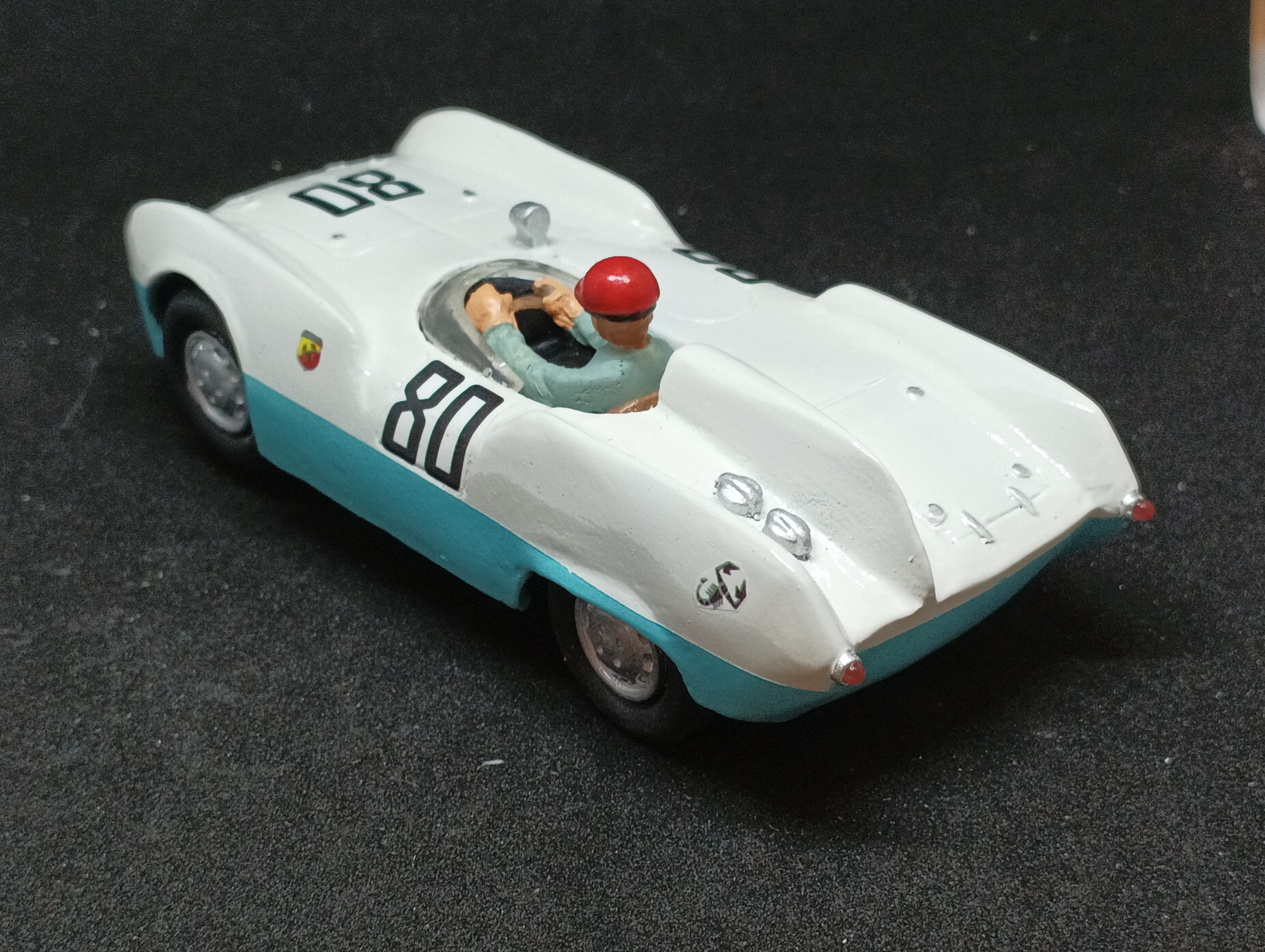The 207A’s first race was the 1955 12 Hours of Sebring, driven by John Bentley and Jim McGee, where it was disqualified (after finishing second in its class) due to what the stewards judged to be irregular refueling on the track, and that is the decoration chosen for this reproduction.